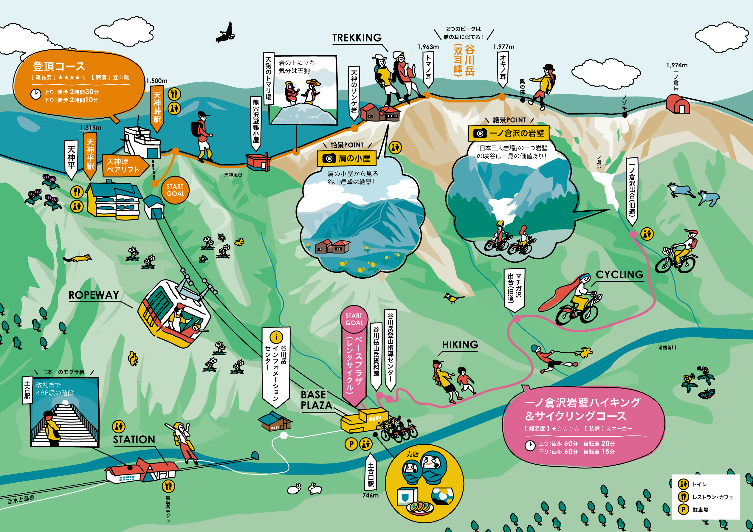 首都圏から2時間、ロープウェイとリフトで上ると、そこは標高1500mの別天地。展望台のカフェで一休みしたら、2000m級の山々を眺めながら虹さんぽロードをのんびり歩く。名物山グルメ・谷川岳パングラタンや岩場を望むサイクリングなど、山を楽しむ出会いが待っています。