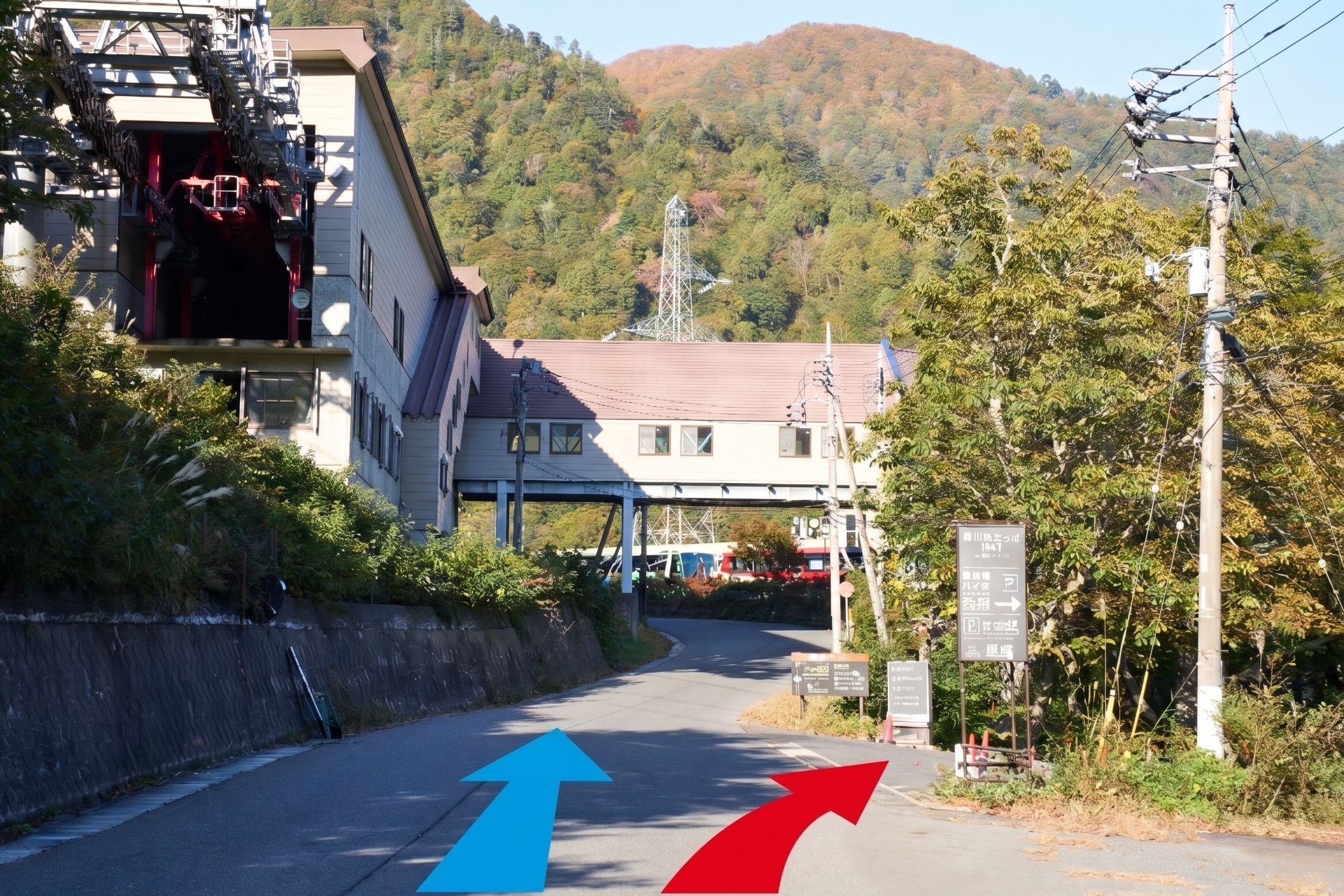 - 左図の赤の矢印に従って屋内駐車場(立体駐車場)にご駐車ください。